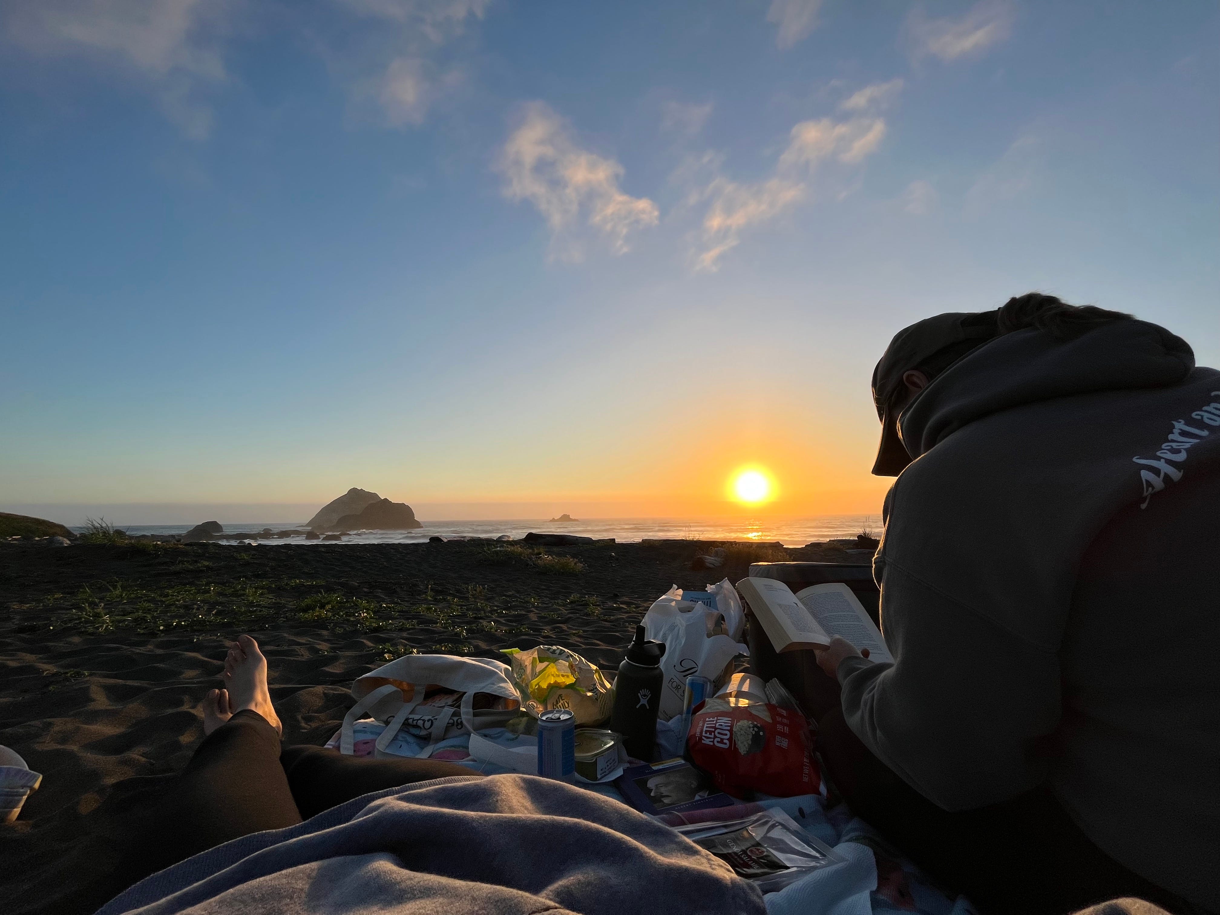 We went back to our motel room for a quick nap before driving back to Klamath to watch the sunset on the Pacific. We stopped at Safeway beforehand and stocked up on picnic foods for dinner. We spent the evening at the beach reading and watching the sky. It was the first time either of us had seen the sunset on the Pacific Ocean. It was incredible; unlike any sunset I’d ever seen before. Seeing the sun disappear behind the coastline was breathtaking. It was amazing to realize you were watching the planet rotate; one of those experiences where you’re acutely aware of your microscopic size and relative insignificance in the context of the entire universe. It was beautiful.