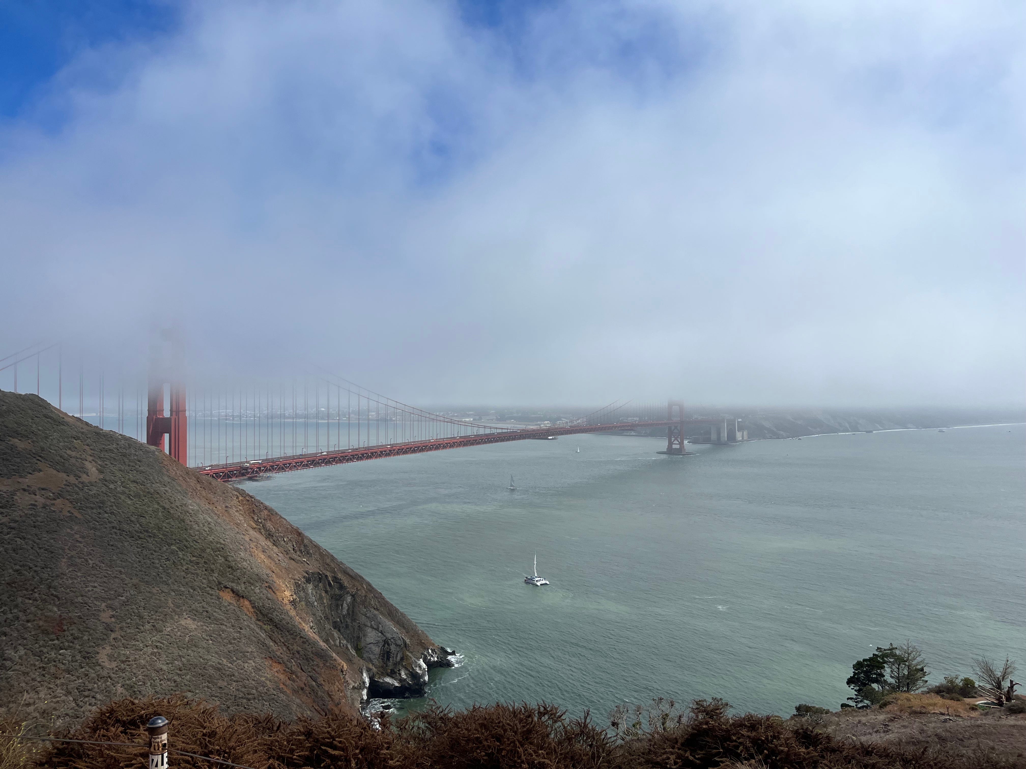 The next day we were off to San Francisco. We drove six and a half hours down Highway 101, partially along the coast but mostly through the forest of Northern California. Finally we saw the turn off on the highway for the Golden Gate Bridge. I took the exit and followed the signs up to the lookout point. It was largely covered by the fog that typically blankets the city, but we were still able to get a partial view.